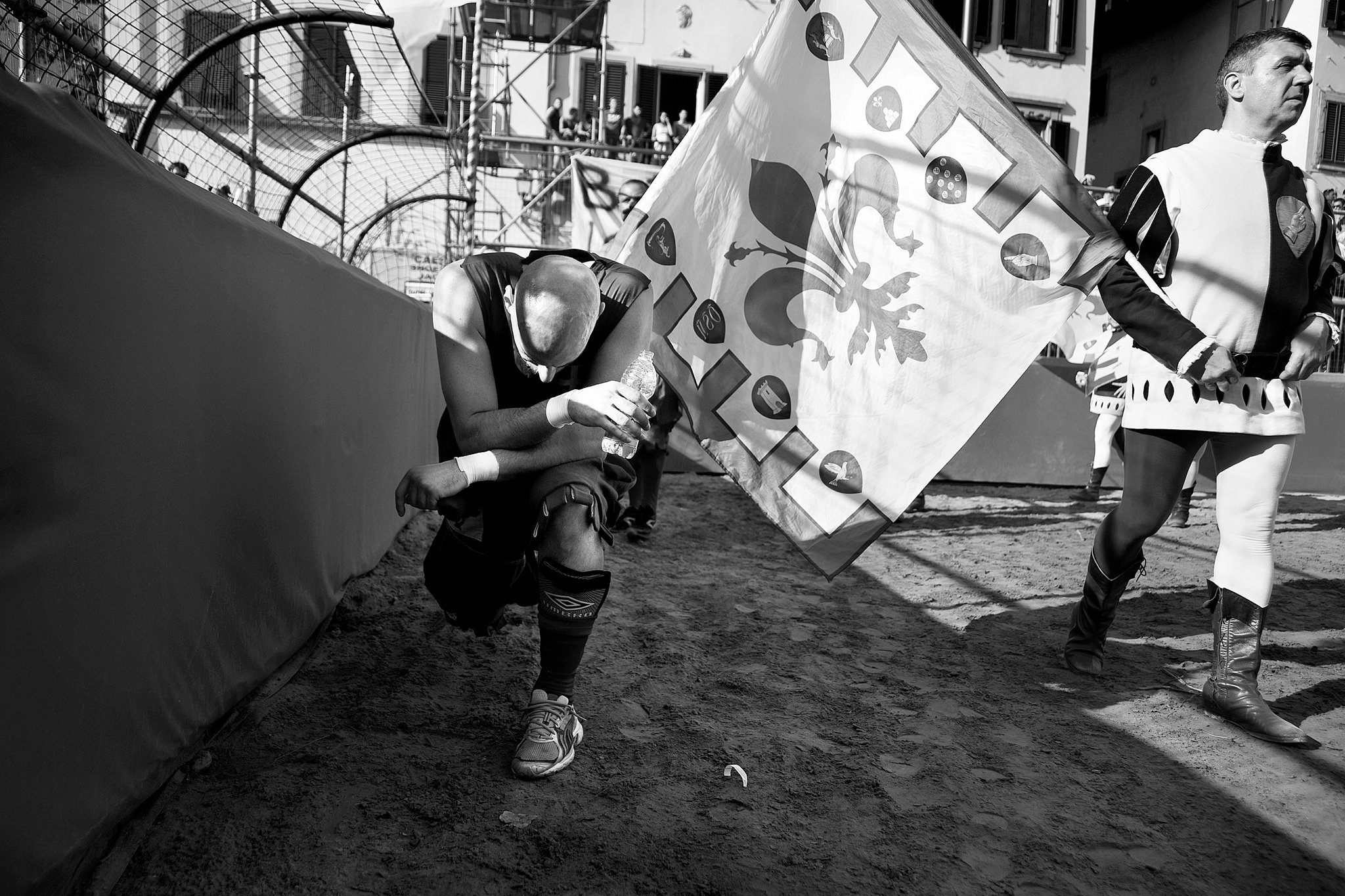 Ineinander verkeilt ringen sie am Boden, schlagen sich mit Fäusten ins Gesicht, angefeuert von den begeisterten Rufen der Zuschauer. Viele florentinische Jungen träumen davon, auch einmal auf dem mit Sand aufgeschütteten Platz "Piazza Santa Croce" im Herzen von Florenz, für ihre Stadtteile um Ruhm und Ehre kämpfen zu dürfen. Die Zeit scheint still zu stehen. Heute wird der Florentinische Fußball "Calcio Storico Fiorentino" noch genau so wie vor 500 Jahren gespielt und hat nichts von seiner Brutalität verloren. Dieser Sport hat, bis auf das gemeinsame Ziel eines Tores, nichts mit unserem Verständnis von Fußball zu tun. 27 Spieler pro Mannschaft kämpfen in einer Mischung aus Rugby, Boxen und American Football in fünfzig Minuten um den Sieg. Damals waren es die Adeligen aus den einflussreichsten florentinischen Familien, heute sind es überwiegend Männer wie Gianni, Luigi oder Pietro. Einfache Arbeiter und Arbeitslose.