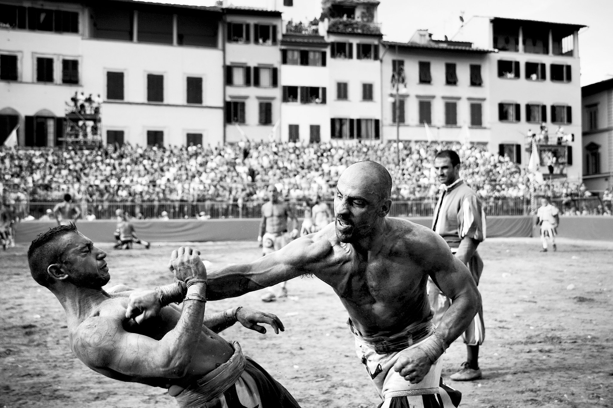Ineinander verkeilt ringen sie am Boden, schlagen sich mit Fäusten ins Gesicht, angefeuert von den begeisterten Rufen der Zuschauer. Viele florentinische Jungen träumen davon, auch einmal auf dem mit Sand aufgeschütteten Platz "Piazza Santa Croce" im Herzen von Florenz, für ihre Stadtteile um Ruhm und Ehre kämpfen zu dürfen. Die Zeit scheint still zu stehen. Heute wird der Florentinische Fußball "Calcio Storico Fiorentino" noch genau so wie vor 500 Jahren gespielt und hat nichts von seiner Brutalität verloren. Dieser Sport hat, bis auf das gemeinsame Ziel eines Tores, nichts mit unserem Verständnis von Fußball zu tun. 27 Spieler pro Mannschaft kämpfen in einer Mischung aus Rugby, Boxen und American Football in fünfzig Minuten um den Sieg. Damals waren es die Adeligen aus den einflussreichsten florentinischen Familien, heute sind es überwiegend Männer wie Gianni, Luigi oder Pietro. Einfache Arbeiter und Arbeitslose.